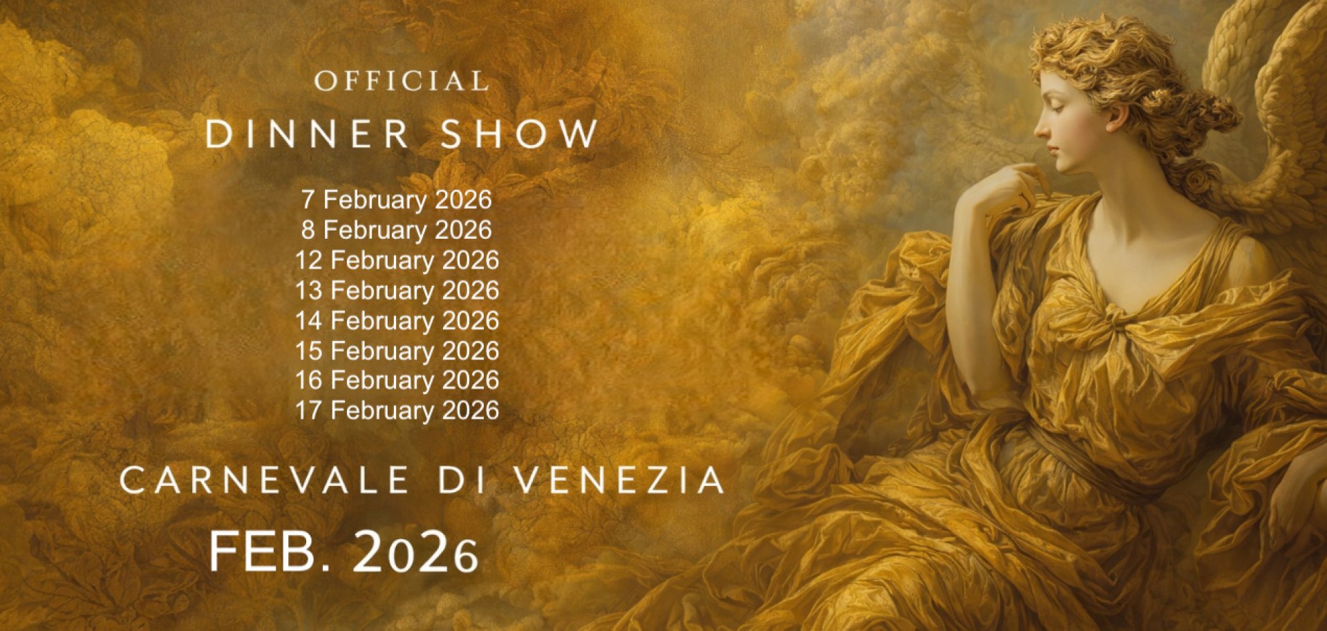 The Venice Carnival Dinner Show 2026 awaits you for an unforgettable experience during the magical nights of the Venice Carnival. The event is scheduled for Saturday, February 7 and Sunday, February 8, and will then continue from Fat Thursday, February 12, through to Mardi Gras, February 17, the closing day of Carnival. Dinners always begin at 9:00 PM, offering you a unique show for unmissable evenings.